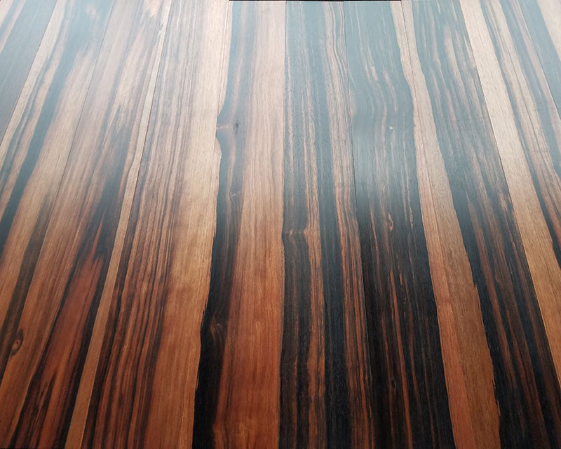 心材黑褐至黄紫褐,有的近黑色或常带黑色条纹。原木杆形差,端面呈不规则状,极少呈正圆或椭圆状。空心较多,出材率极低,约为百分之十到十五。木材表面光泽好,手感润滑,摸上去缎子似的,亮里透光,颜色变化小,丝丝游动的黑色木纹若隐若现,含蓄而不张扬。