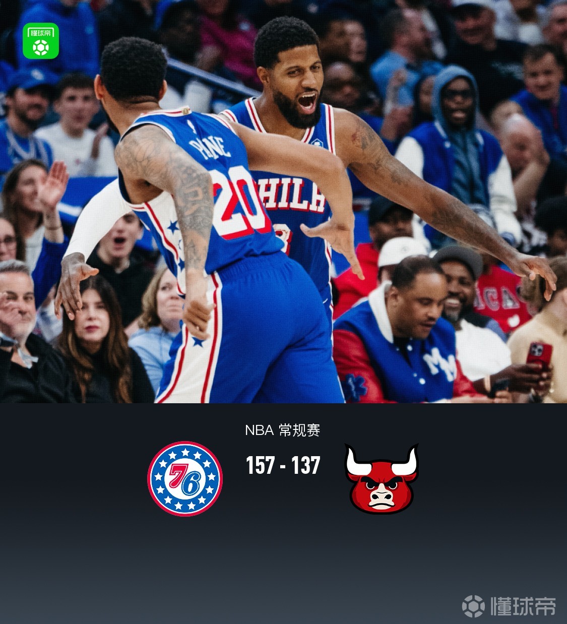 76人157-137大胜公牛,恩比德35+6+7,乔治复出28分