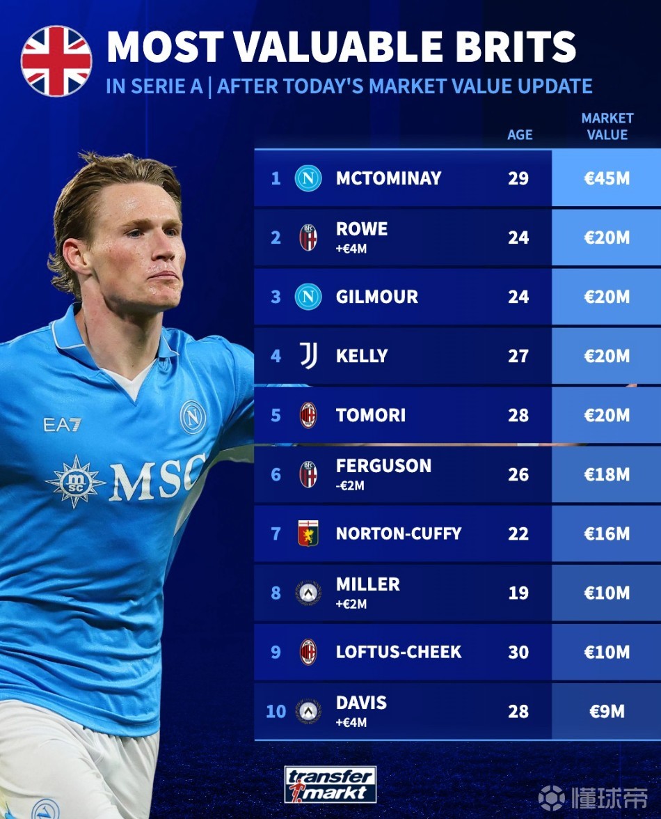 北京时间3月24日,在更新了意甲球员的身价之后,德转统计出了此次更新后意甲身价排名前10的英国球员,麦克托米奈以4500万欧元排名第1,劳埃德-凯利、托莫里、洛夫图斯-奇克上榜。