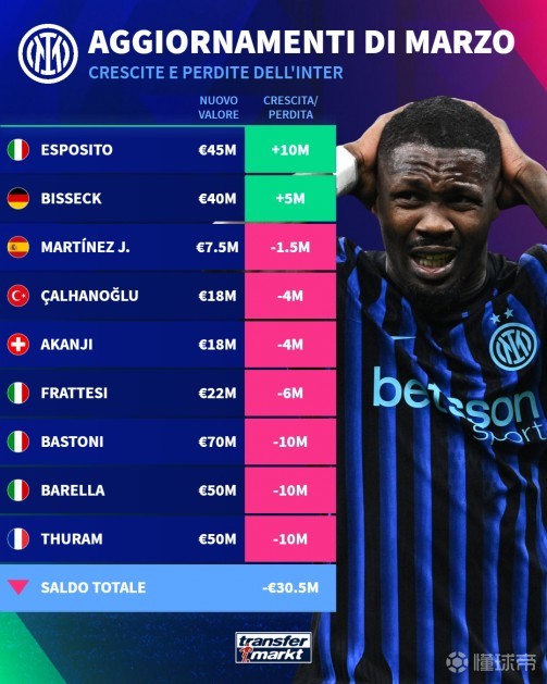北京时间3月24日,德转更新了意甲球员身价,其中国际米兰队内7名球员身价下跌,总跌幅达到了4550万欧元,仅皮奥-埃斯波西托和比塞克身价上涨。