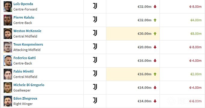 北京时间3月24日,德转对意甲球员的身价进行了更新,麦肯尼上涨800万欧,奥蓬达、库普下跌800万欧。