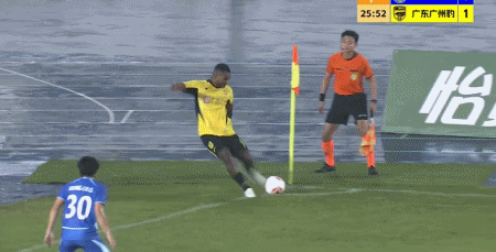 第26分钟,侯煜助攻,韩轩侧勾破门将比分扩大,广东广州豹2-0佛山南狮