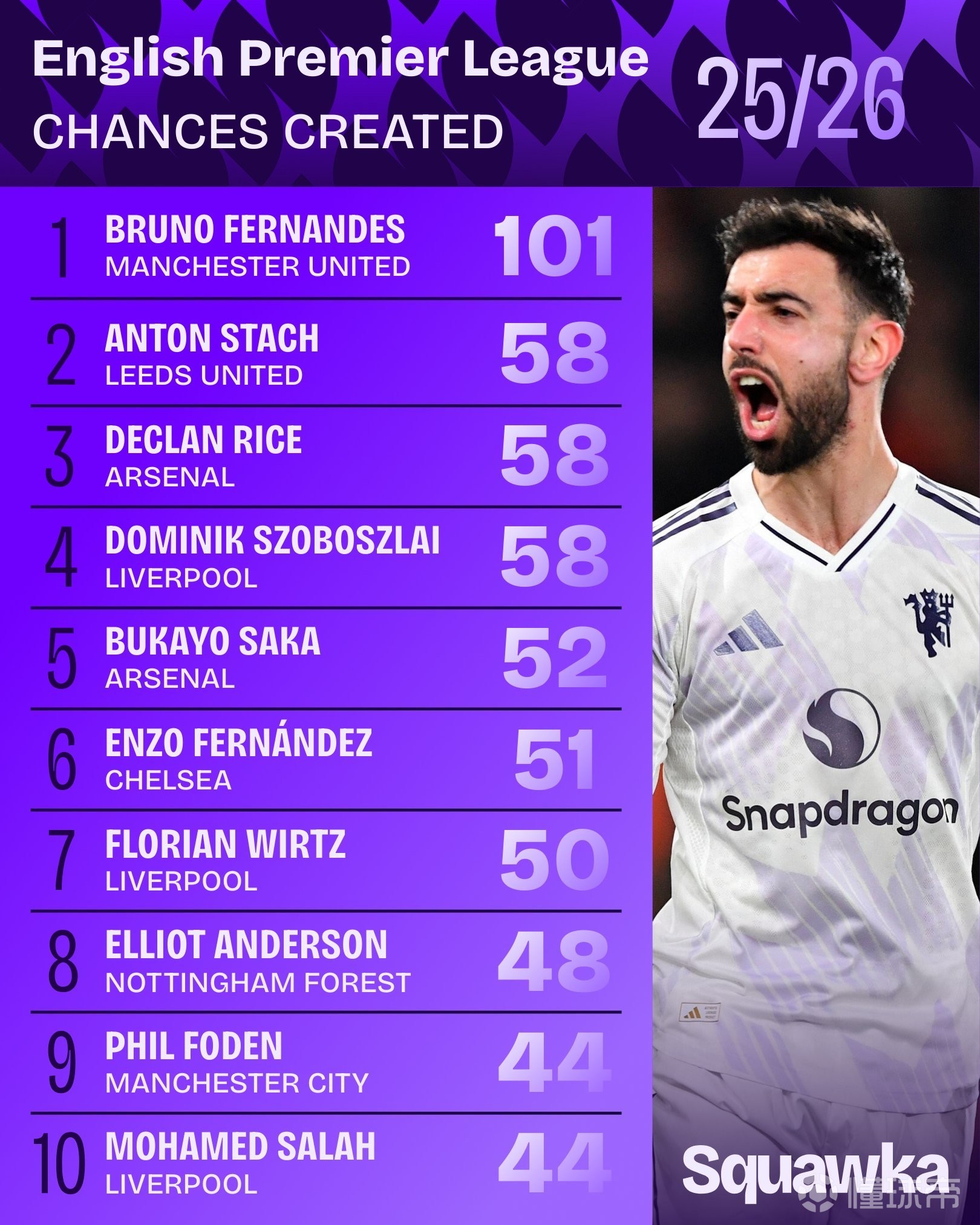近日,知名数据机构Squawka发布了本赛季截至目前的英超创造机会榜。曼联中场布鲁诺-费尔南德斯以创造101次机会遥遥领先该榜单。