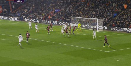那么在这场比赛,曼联的弱点是如何暴露出来的?其实就发生在第27分钟这次高位逼抢,伯恩茅斯分到边路之后,库尼亚稍微松懈一点点,他们就成功抢到了卡塞米罗的身前,从而制造了他的黄牌:
