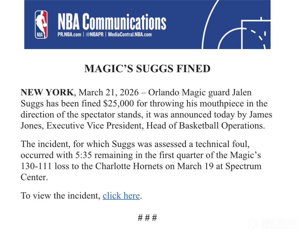 在3月20日魔术对阵黄蜂的比赛第一节中,魔术球员萨格斯将牙套扔向了观众席,他因此也被罚款25000美元。