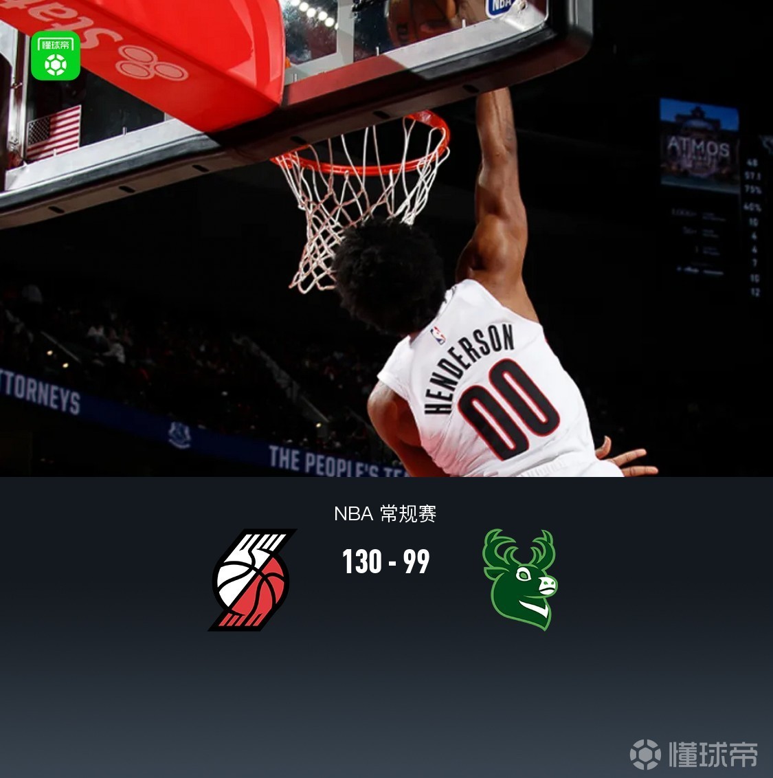 波特兰开拓者斯科特-亨德森23分3板4助,格兰特18分2板;密尔沃基雄鹿莱恩-罗林斯36分4板4助,迪昂16分4板4助。