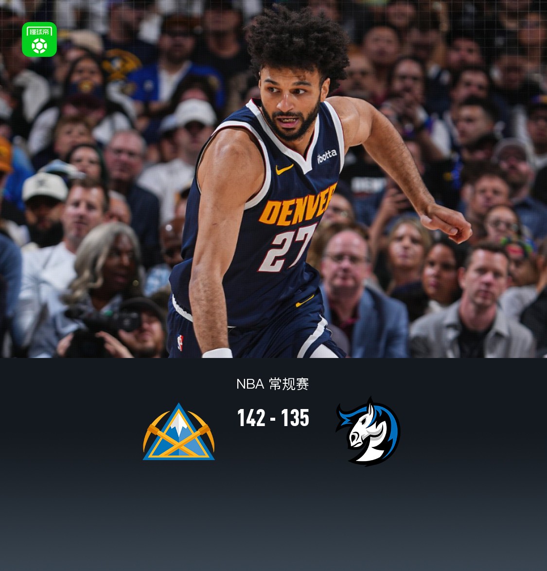 第四节掘金贾马尔-穆雷拿下17分,独行侠弗拉格拿下12分,最终掘金142-135战胜独行侠
