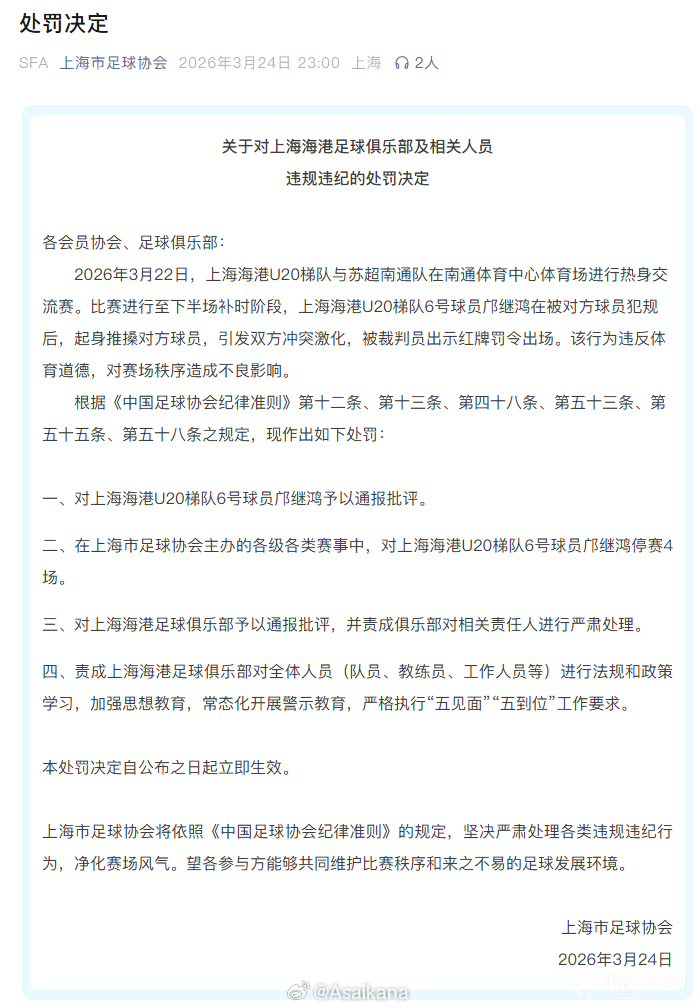 江苏足协和上海足协分别对3月22日“苏超”南通队和上海海港U20队热身赛中发生的多人互殴事件进行了处罚。南通队程鑫、张浩楠在江苏省内停赛8场,薛天翼江苏省内停赛5场,季桑楠江苏省内停赛3场;上海海港U20邝继鸿通报批评并在上海市内停赛4场。两队还分别被通报批评及被责成进行法规政策学习和思想教育。