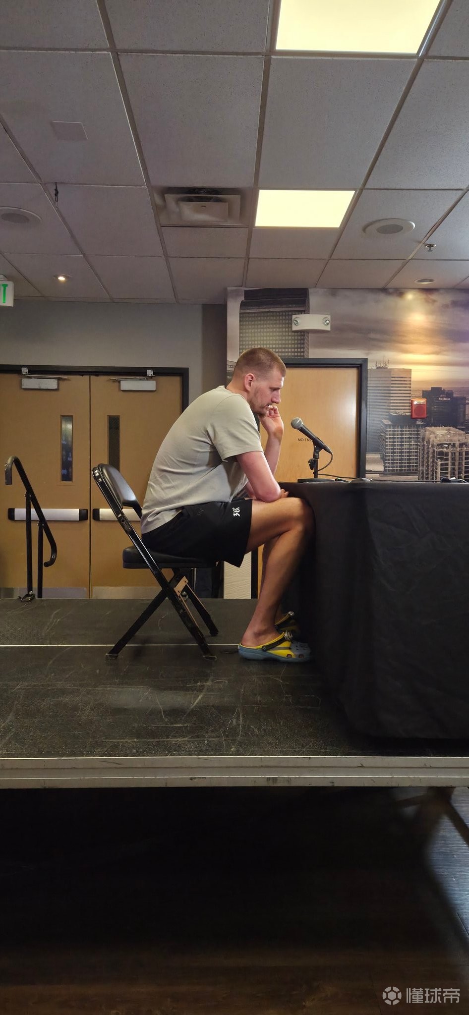 赛后,约基奇出席了新闻发布会。据掘金摄影记者RyanGreene报道,约基奇在出席发布会时展现了其内心可爱的一面,球员脚踏小黄人系列洞洞鞋接受采访。