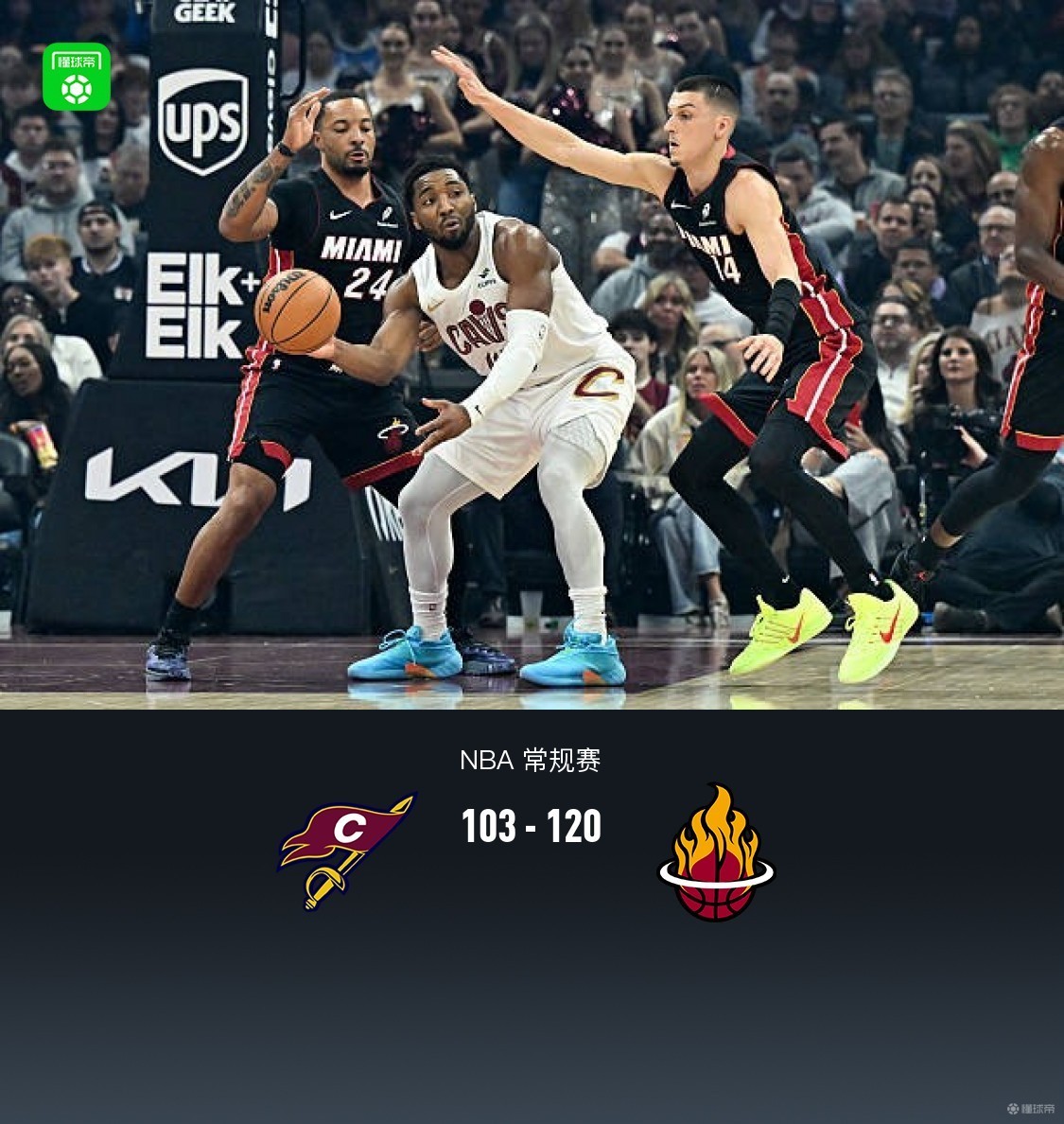第四节骑士哈登拿下6分,热火拉尔森拿下9分,最终骑士103-120不敌热火
