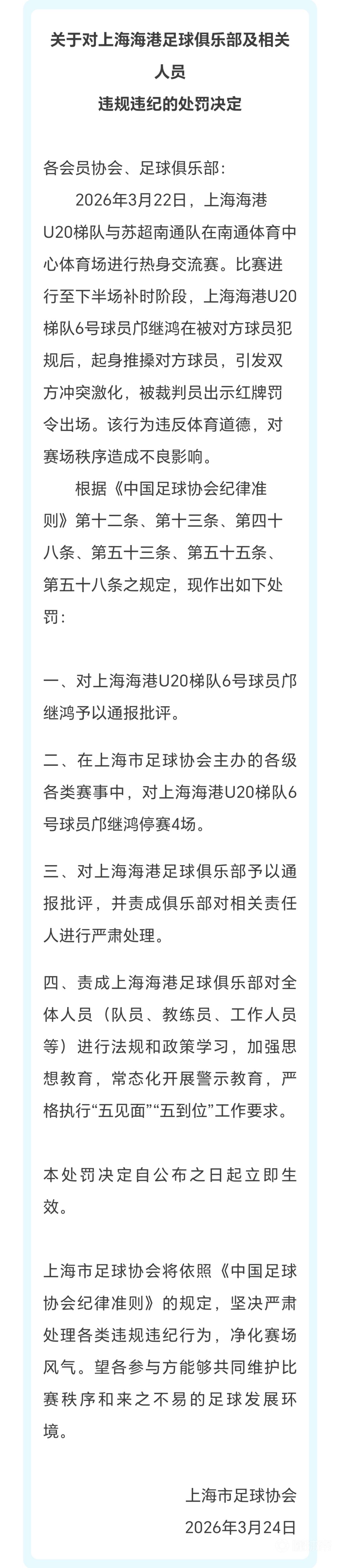 苏超南通队对海港U-20队热身赛打架的事,上海足协出面处罚了海港小球员,停赛4场!江苏足协处罚南通队员,停赛5-8场,铁路警察,各管一段。中国足协没亲自出面,由地方足协负责处罚。 南通队多名球员遭到重罚,本赛季苏超成绩估计要受到点影响了。