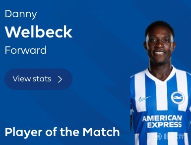 英超第31轮,布莱顿主场2-1击败利物浦,此役上演梅开二度的布莱顿前锋维尔贝克当选全场最佳球员。
