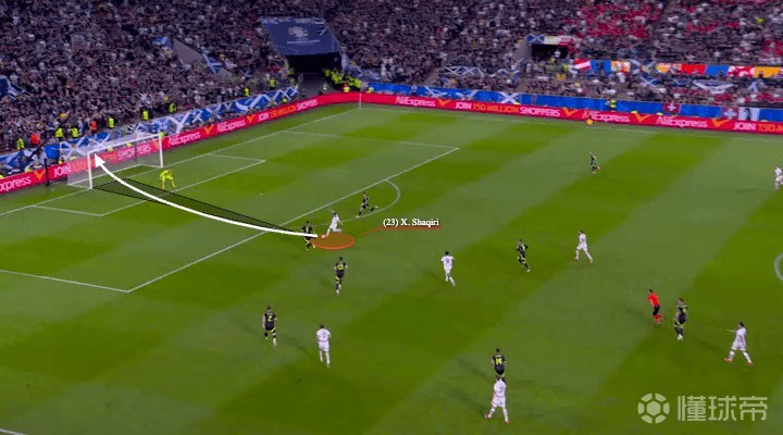 ……但同样,许多球员可能会先停一下球再射门。然而沙奇里选择直接打门,打了安格斯-冈恩一个措手不及,同时由于苏格兰门将站位不佳,他眼前可瞄准的球门角度也更开阔了。