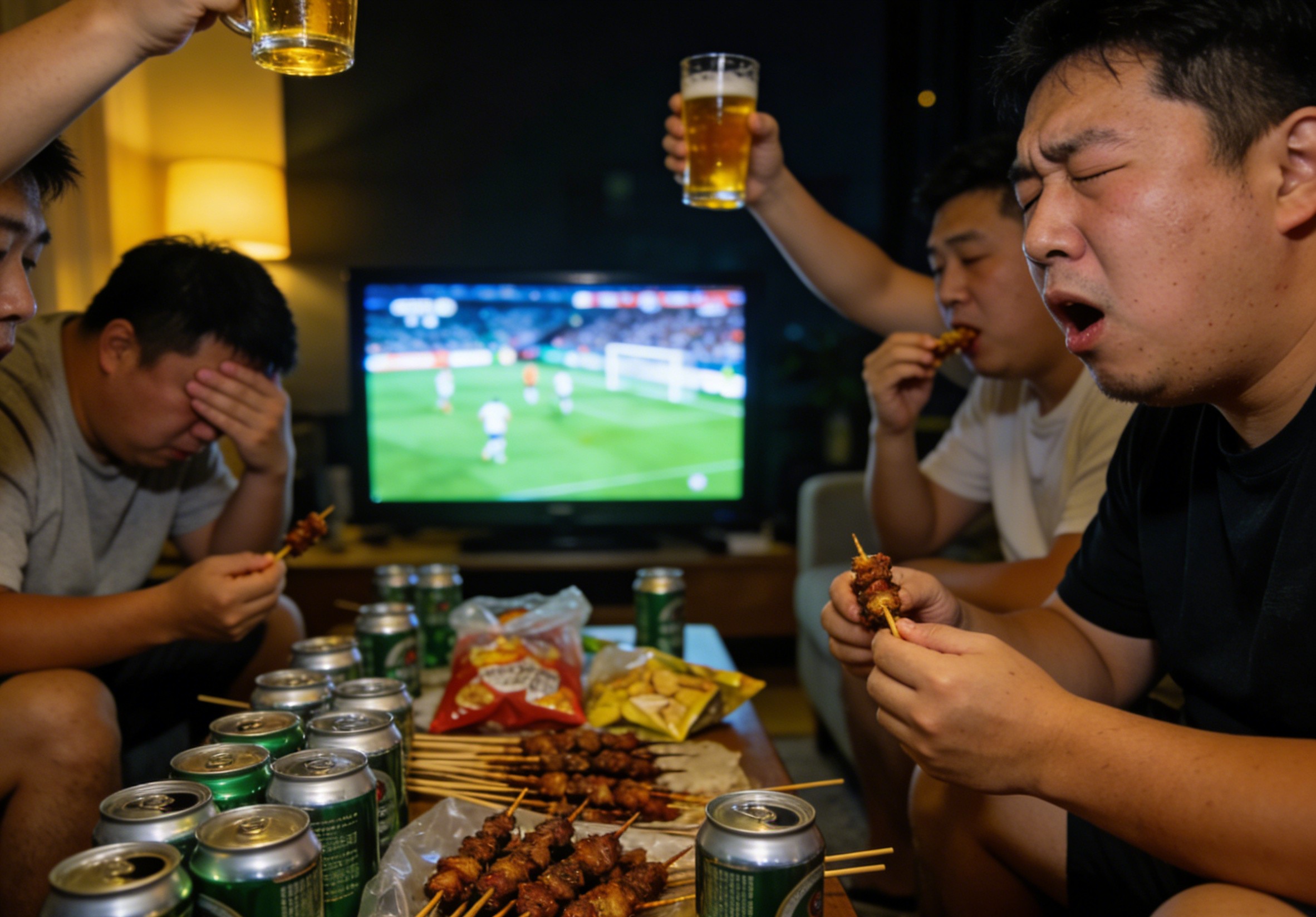 但事实上,无论是熬夜工作还是熬夜看球,对身体的伤害本质上没有区别,因为熬夜这个行为本身就是对身体的透支,而大部分球迷凌晨看球时,往往又会一边喝啤酒、吃宵夜,一边为球队的输赢揪心,时而狂喜,时而暴怒,这种“熬夜+情绪剧烈波动+非常规时间饮食+酒精摄入”的组合,正是心脏健康的致命杀手。