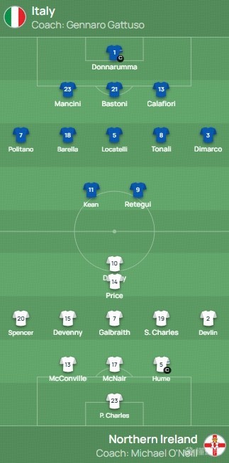 意大利首发:1-多纳鲁马、23-曼奇尼、21-巴斯托尼、13-卡拉菲奥里、7-波利塔诺、18-巴雷拉、5-洛卡特利、8-托纳利、3-迪马尔科、11-基恩、9-雷特吉