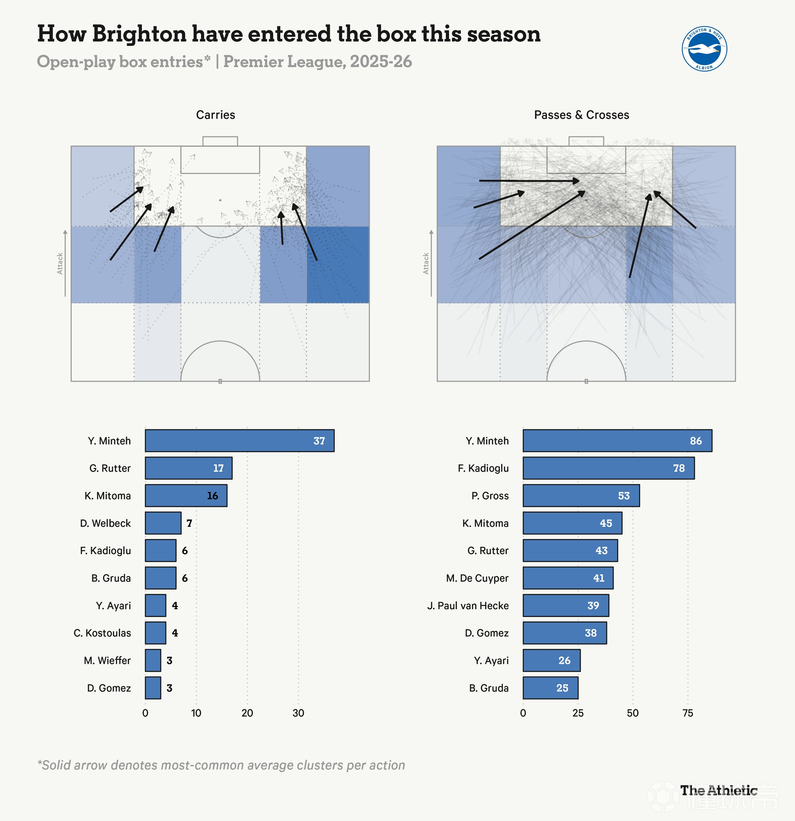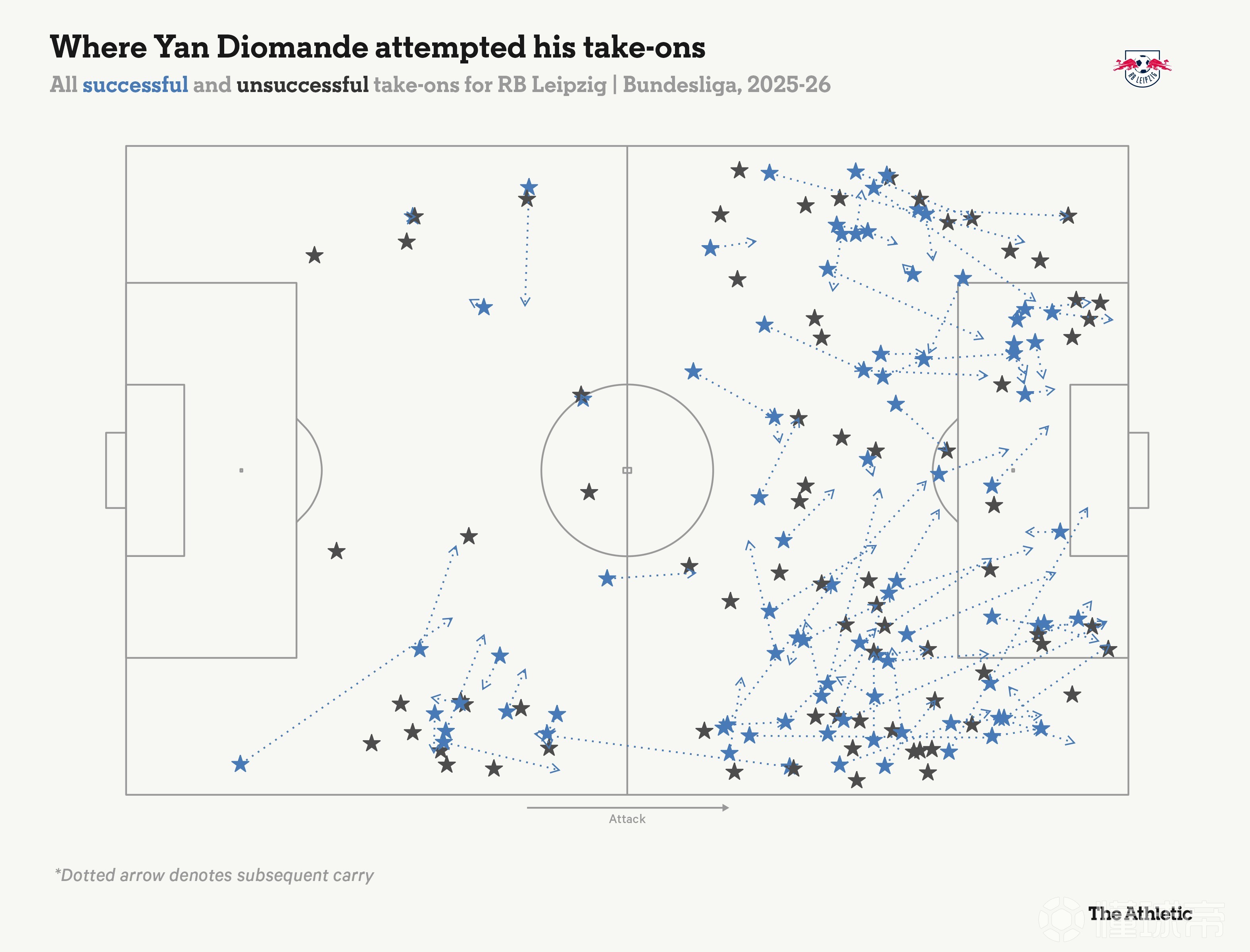 这位科特迪瓦国脚去年夏天才从莱加内斯转会至RB莱比锡,但已引起广泛关注。如上图所示,迪奥曼德非常喜欢盘带……非常频繁。在欧洲顶级联赛所有球员中,只有维克托-穆尼奥斯(奥萨苏纳)、维尼修斯(皇家马德里)和亚马尔(巴塞罗那)的过人次数比他更多——如下图所示,他能在两条边路都完成突破。