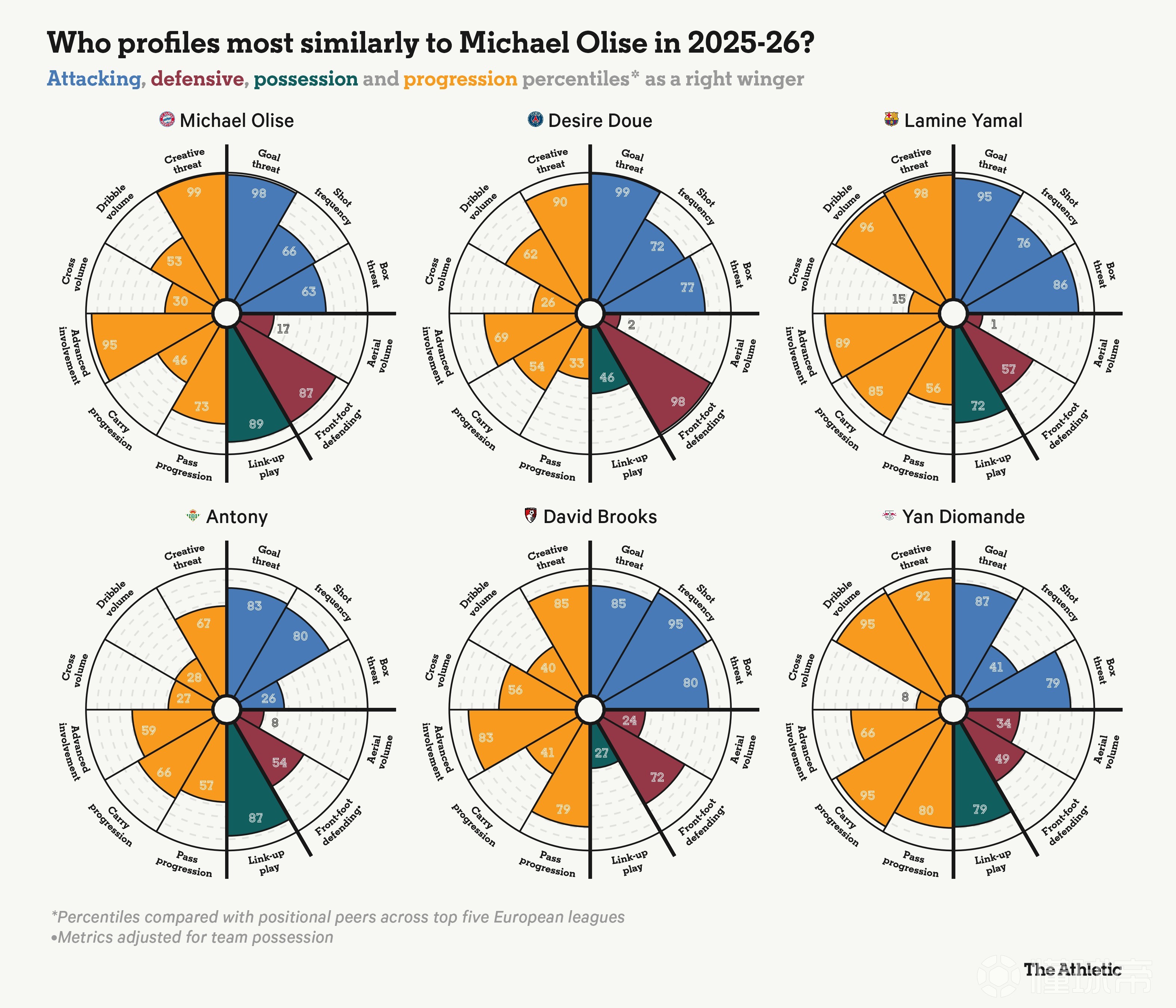 目前很少有左脚右边锋能达到更高的水准:在欧洲五大联赛中,没有人能比奥利塞的17次助攻更多。他拥有沉肩变向、在防守球员间穿梭以及在高速奔跑中完成致命一击的能力,让他成为足坛稀缺的异类球员。。